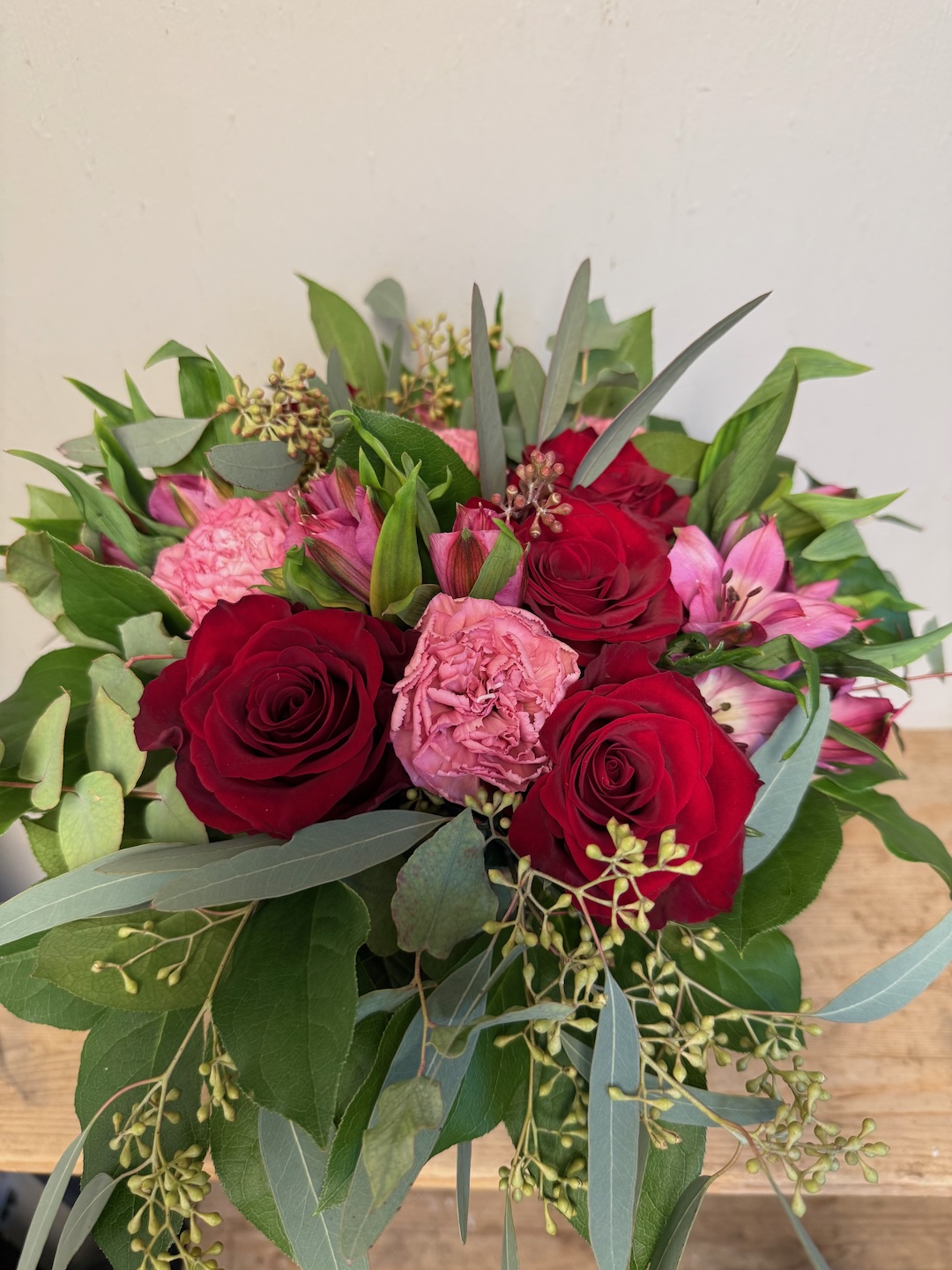 Gavebukett er en bukett med røde roser, neliker og alstromeria med innslag av bærpoppel.