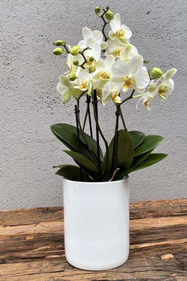 Tre hvite flott orkidéer plantet med orkidéjord i glassvase. Høyde inkl. glassvase varierer fra 62-76cm.