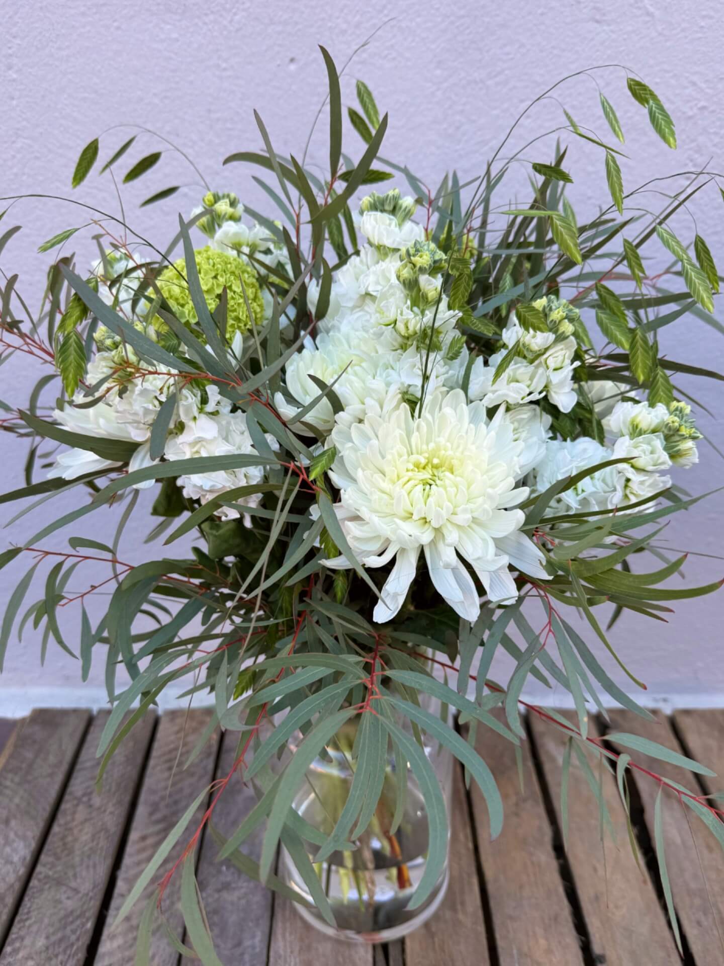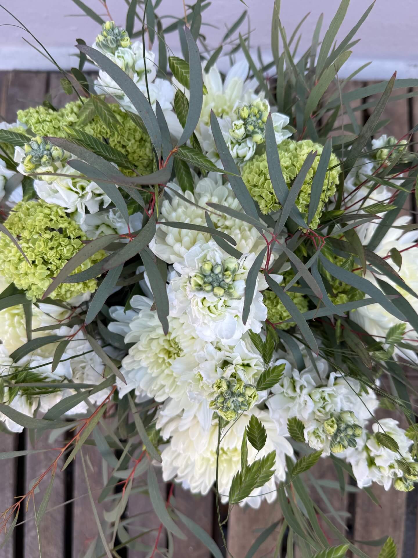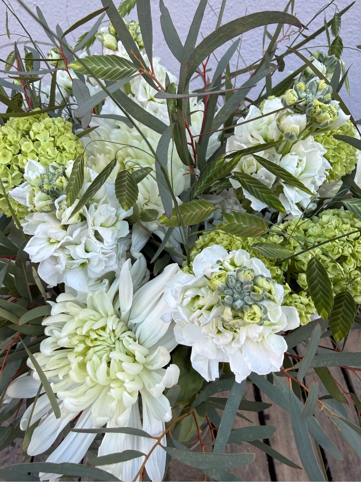 En elegant og naturlig bukett i hvitt og grønn, som består av med hvit chrysanthemum, levkøyer, poppel, viburnum og hjertestrå.