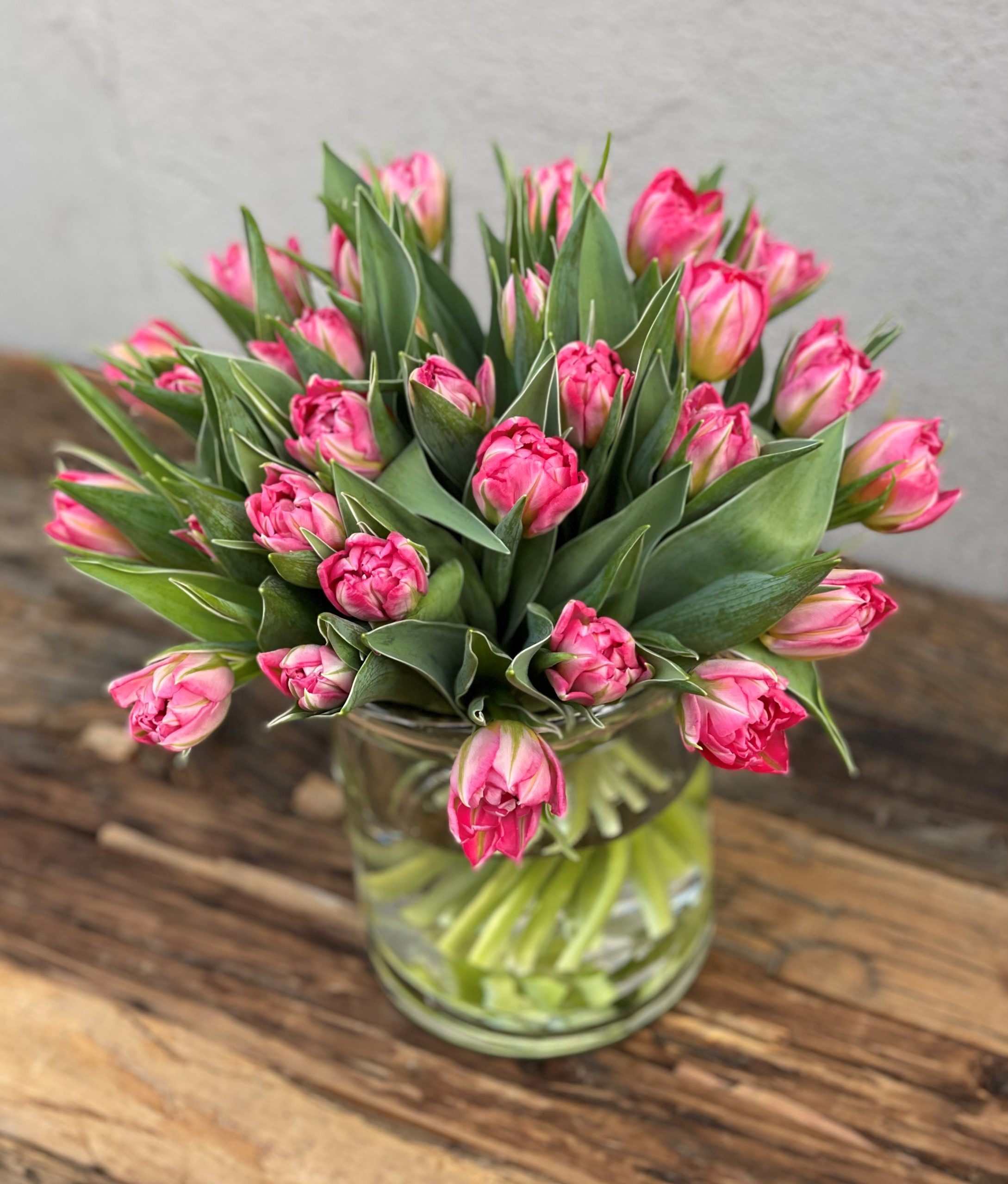 Klassisk bukett med 10, 20 eller 30 rosa doble tulipaner. Buketten avbildet består av 30 tulipaner og koster 585 kr.