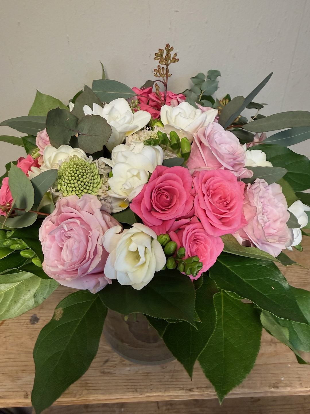 Rosetoner er en bukett med rosa toner roser, fresia og scabiosa, og innslag av eucalyptus.