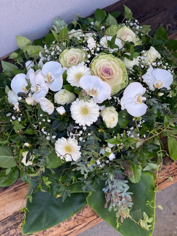 Vakker rund båredekorasjon i hvitt og grønt. Dekorasjonen avbildet koster 1800kr. Kan hentes hos oss eller vi kan levere direkte til seremonien en time før start. Avvik fra produktbildet kan forekomme grunnet tilgjengelighet av blomster og sesong, tross dette streber vi etter å lage dekorasjonen så lik bildet som mulig.